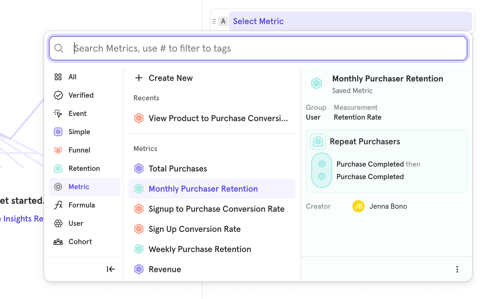 From an Insights report, you can select metrics and behaviors of all types. From Funnels and Retention reports, you will see only metrics and behaviors for that report type.