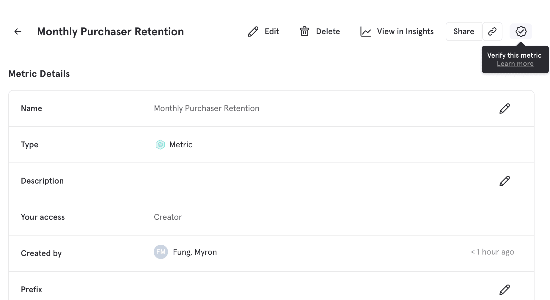 • Verify: Add Verified badges to the metric/behavior. Only project Admins and Owners can verify entities in the Lexicon.